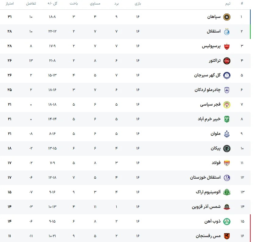 جدول لیگ برتر ایران در آخرین روز هفته شانزدهم دست خوش تغییرات شد.