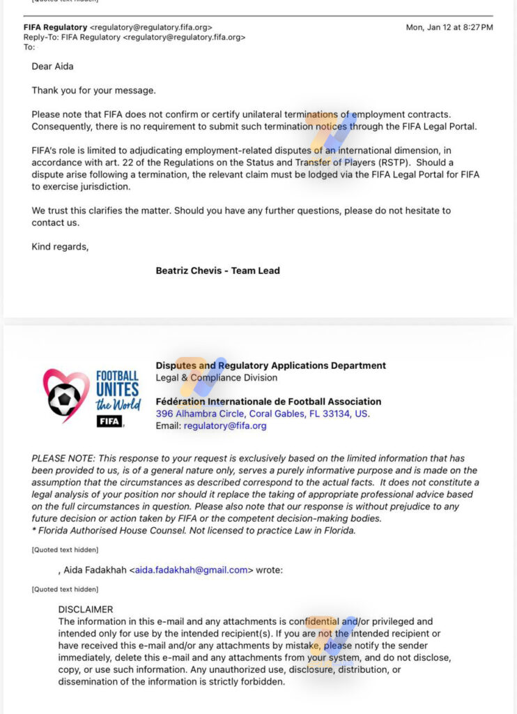 به استحضار میرساند که فیفا فسخهای یکجانبهٔ قراردادهای استخدامی را تأیید یا گواهی نمیکند.