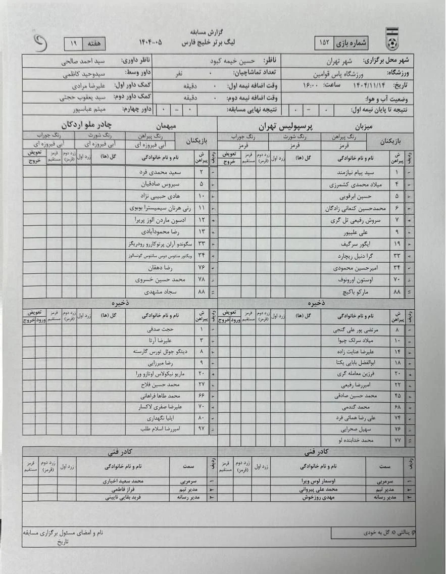 داوران| داور: وحید کاظمی کمکها: علیرضا مرادی و یعقوب حجتی داور چهارم: میثم عباسپور ناظر: احمد صالحی داور VAR: موعود بنیادیفرد کمک: بهاره سیفی نهاوندی