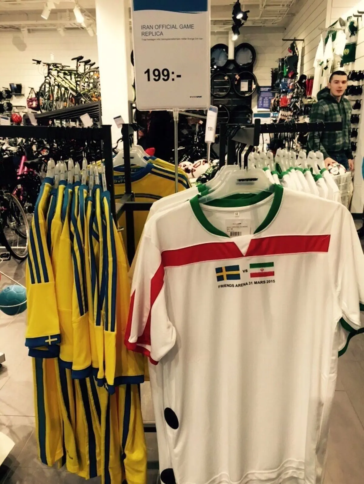 ایران و سوئد فردا شب در دیداری دوستانه به مصاف هم می روند. به گزارش سایت تیم ملی، در حالی که تیمهای ایران و سوئد در دیداری دوستانه، فردا شب به میزبانی این کشور به مصاف هم می روند، لباس های ویژه ای از سوی فروشگاه های ورزشی برای این دیدار برای هواداران تدارک دیده شده است. در این لباسها روی پیراهن تیم ملی، پرچم ایران و سوئد چاپ شده است تا بدین ترتیب این پیراهن ها به طور انحصاری برای این بازی به فروش برسند. گفته می شود قیمت این لباسها برای هواداران ایرانی، ۲۰ یورو است.