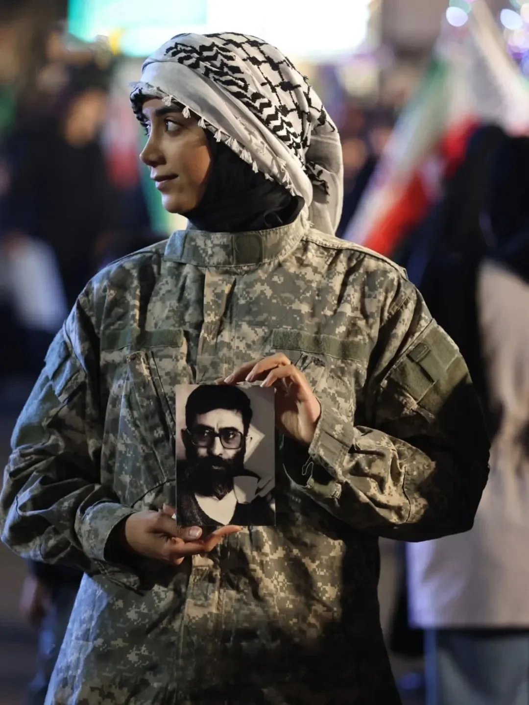 چفیه معروف را به سر بسته؛ لباس نظامی به تن کرده؛ پوشش کامل است. قاب عکسی از جوانی رهبر شهید را به دست گرفته. میبینید با هر نوع پوششی چه با حجاب و چه بیحجاب، دوستدار رهبر و نظام و وطن هستند.