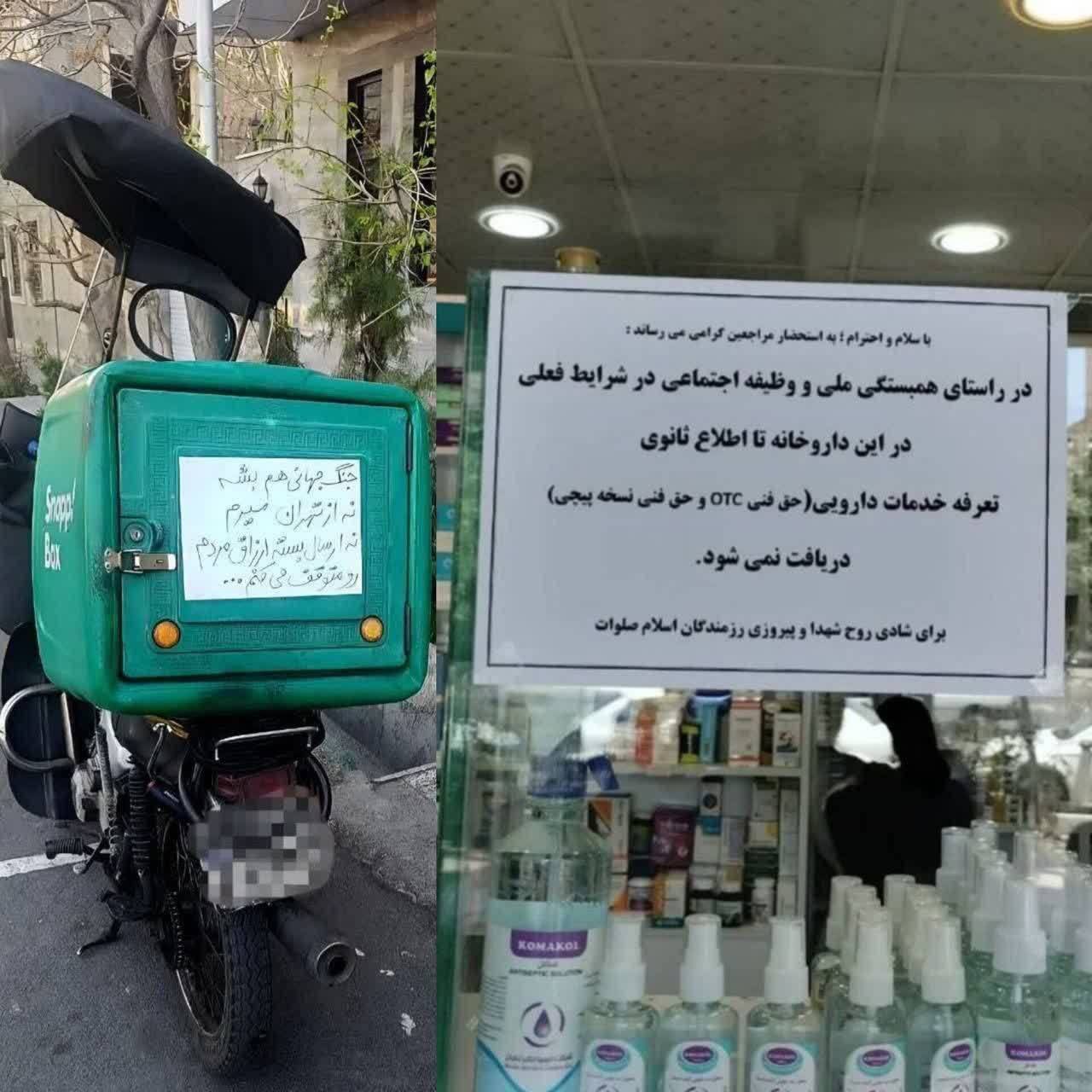 این مردم را نمیشود شکست داد؛ نوشته پشت شیشه داروخانه: «در راستای همبستگی ملی و وظیفه اجتماعی در شرایط فعلی در این داروخانه تا اطلاع ثانوی تعرفه خدمات دارویی دریافت نمیشود.» در عکس دیگر نوشته روی باکس پیک موتوری هم جالب است. «جنگ جهانی هم بشه نه از تهران میرم نه ارسال بسته ارزاق مردم رو متوقف میکنم.» درود به شرفتان...