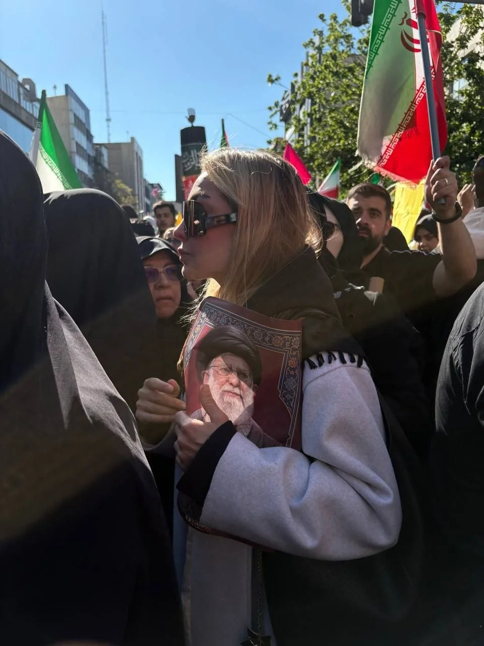 عینک برند گوچی بر چشم زده و عکس رهبر شهید را اینگونه به آغوش کشیده؛ در مراسم اربعین شهادت رهبر انقلاب... در کنار بانوان محجبه، دوشادوش یکدیگر پشت وطن و نظام ایستادهاند.