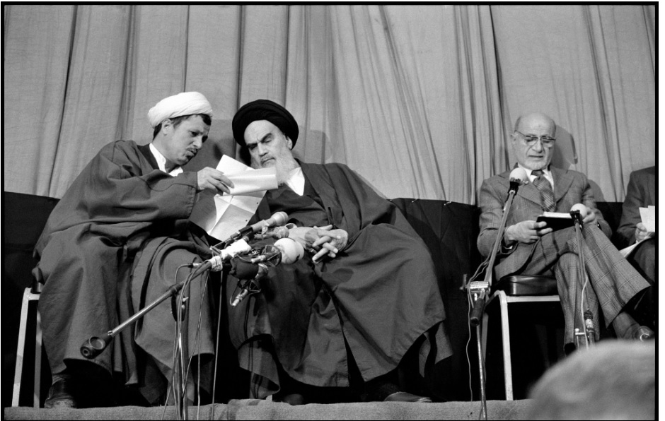 آیتالله خمینی در مراسم انتصاب مهدی بازرگان به نخستوزیری دولت موقت. آیتالله هاشمیرفسنجانی نیز در تصویر دیده میشود - ۱۶ بهمن ۱۳۵۷