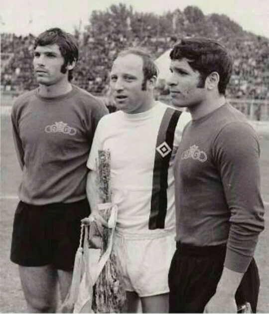 تاج ۱ - هامبورگ ۲؛ پرویز قلیچخانی و اووه زیلر و کارو حقوردیان را در حاشیه یک بازی دوستانه با هامبورگ آلمان میبینید.