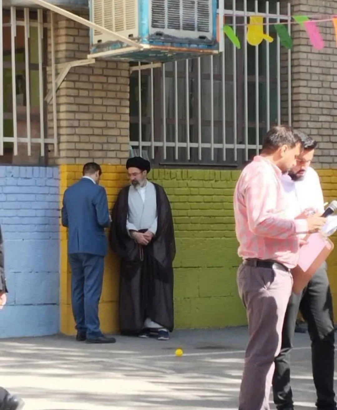 عکس کمتر دیده شده از سیدمجتبی خامنهای یادگار رهبر شهید انقلاب. جایی که در کنار دیوار رنگی مکانی نامعلوم به همراه یک نفر ایستاده است.