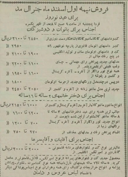 قیمتها هم جالب توجه است؛ مثلا در آگهی زیر برای فروش نیمه اول اسفند برای عید نوروز در فروشگاههای جنرال مد در خیابان سعدی بالا و لالهزار (کوچه برلن) قیمت اجناس برای بانوان و دوشیزگان برای انواع کت و دامن کانگا دستدوز از 2850 تا 3100 ریال است. یا اجناس برای آقایان و آقا پسرها؛ عالیترین نوع کت و شلوارهای مردانه فاستونی گاباردین و اسپرتکس از 2000 شروع میشود و به 3000 ریال میرسد.