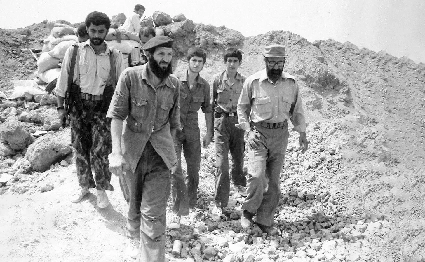 شهید دکتر مصطفی چمران در کنار شهید سیدمجتبی هاشمی و برخی اعضای گروه فدائیان اسلام در جبهه جنگ - سال 1359