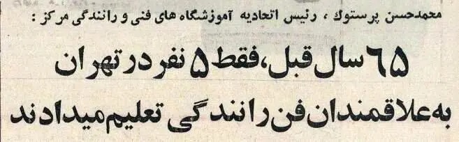 اولین آموزشگاههای تعمیر و رانندگی خودرو در تهران سال ۱۳۰۸ تاسیس شدند. روزنامه اطلاعات ۱۸ دی ۱۳۵۴ در گفتوگو با رئیس اتحادیه آموزشگاههای فنی و رانندگی مرکز، مروری بر تاریخچه آموزش رانندگی در تهران را منتشر کرد.
