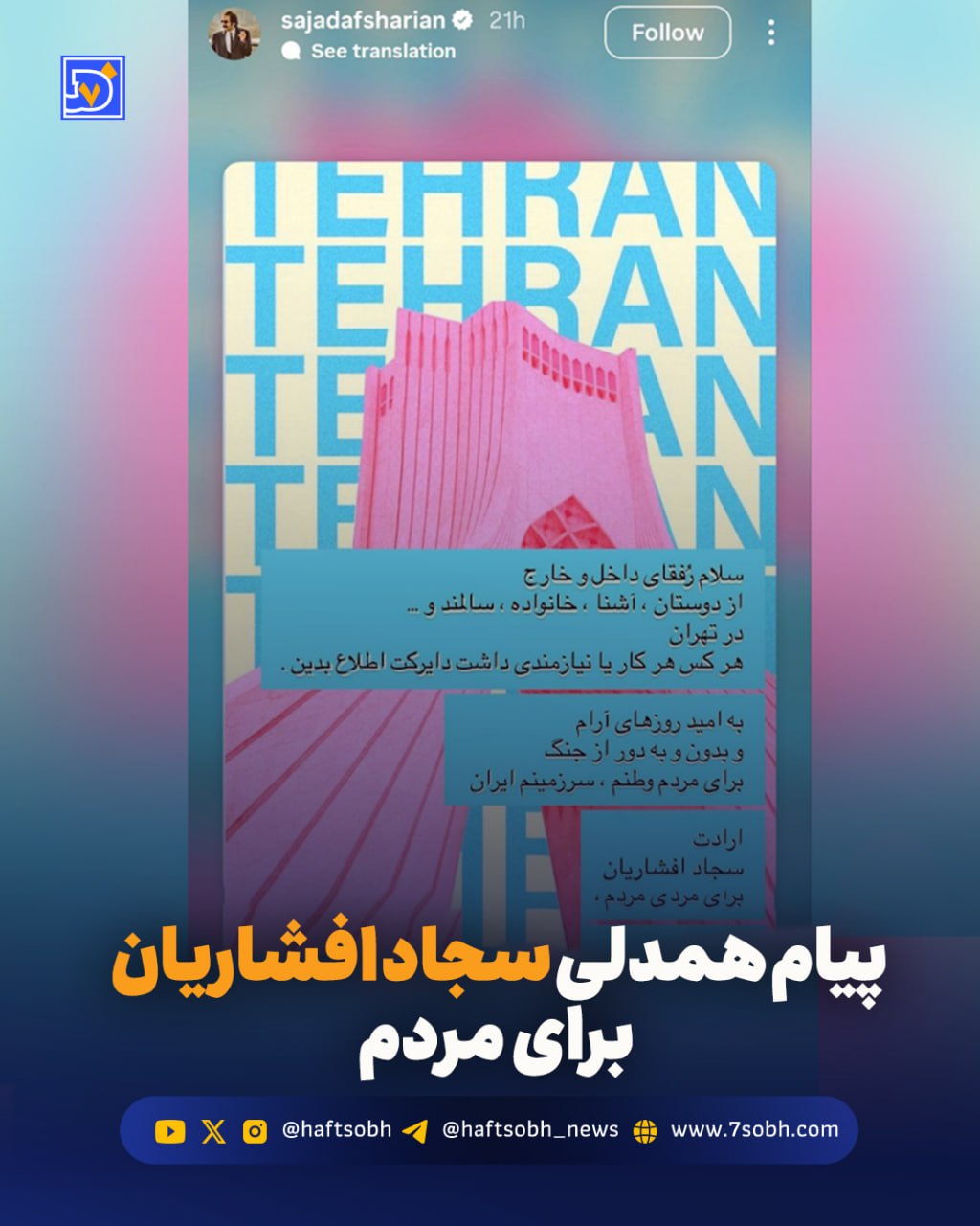 او در این پیام خطاب به دوستان، آشنایان و همشهریان در تهران نوشت هر کس کاری یا نیازی دارد میتواند به او پیام بدهد تا در حد توان کمک کند.
