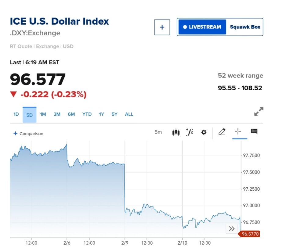 شاخص دلار آمریکا (DXY) امروز بیستودوم بهمن ۱۴۰۴ (یازدهم فوریه ۲۰۲۶) تا این لحظه به سطح ۹۶.۵۷۷ رسیده و قیمت دلار آزاد در ایران ۱۶۳,۶۰۰ تومان است.