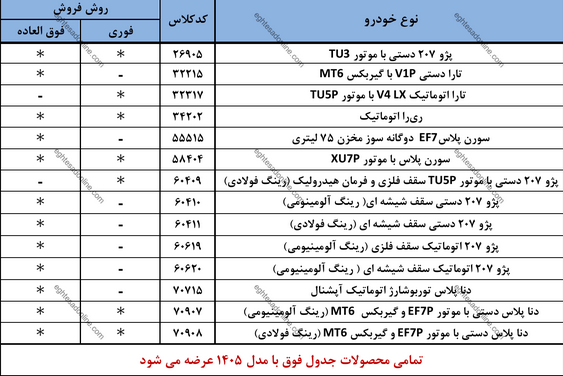 پژو ۲۰۷ با موتور TU3، تارا V1P، ریرا، تارا اتوماتیک V4، سورن پلاس XU7P، سورن پلاس EF7 دوگانهسوز، پژو ۲۰۷ دستی سقف فلزی TU5P، پژو ۲۰۷ سقف شیشهای TU5P، پژو ۲۰۷ اتومات سقف فلزی، پژو ۲۰۷ اتومات سقف شیشهای، دنا پلاس توربو آپشنال، دنا پلاس دستی ۶ سرعته EF7P، و دنا پلاس دستی ۶ سرعته EF7P با رینگ فولادی است.