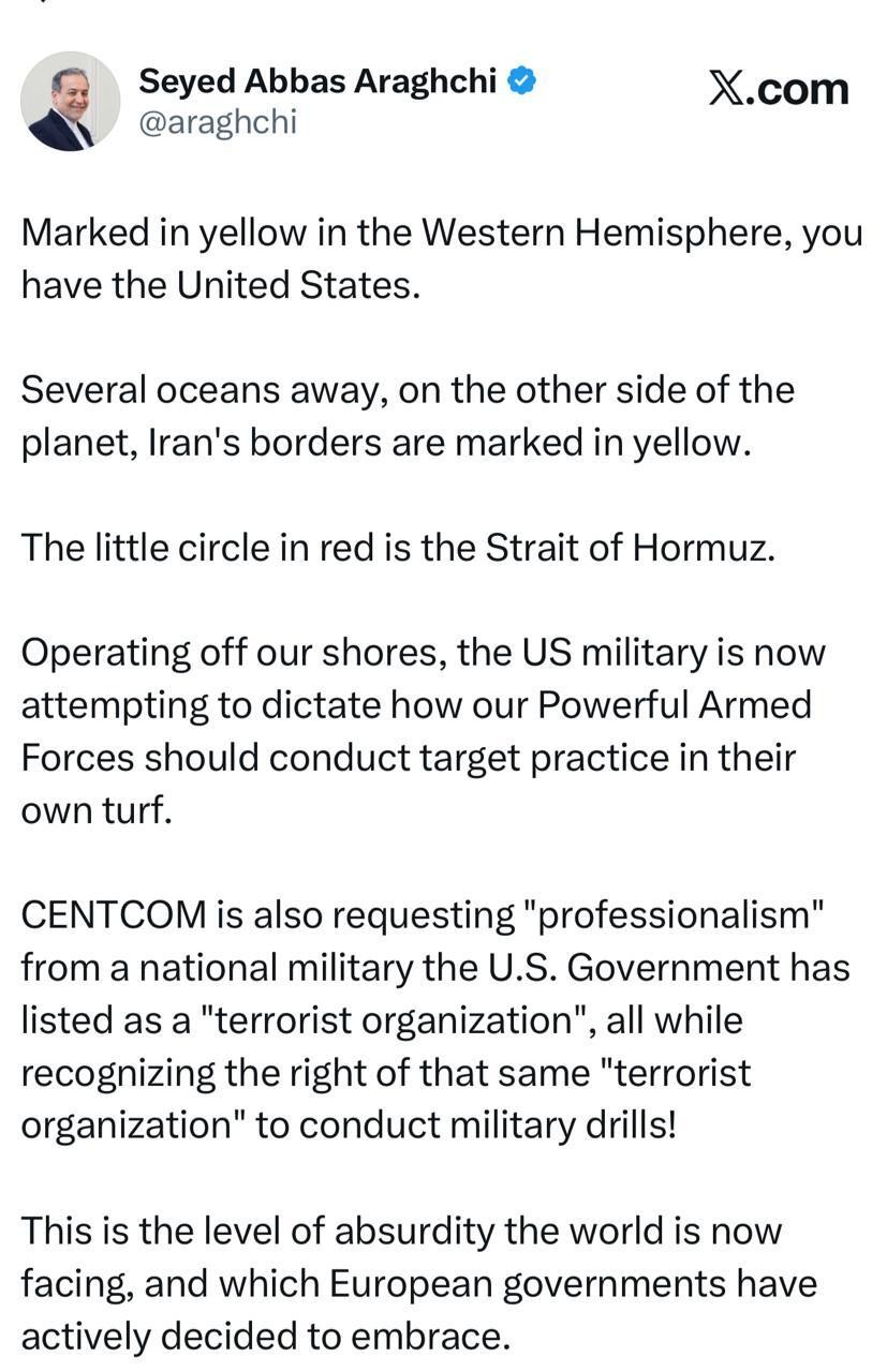 آزادی ناوبری و عبور امن کشتیهای تجاری در تنگهٔ هرمز برای ایران به همان اندازه حیاتی است که برای همسایگان ما. حضور نیروهای فرامنطقهای در منطقهٔ ما همواره نتیجهای برخلاف ادعاهای آنها داشته است: تشدید تنش بهجای کاهش تنش.