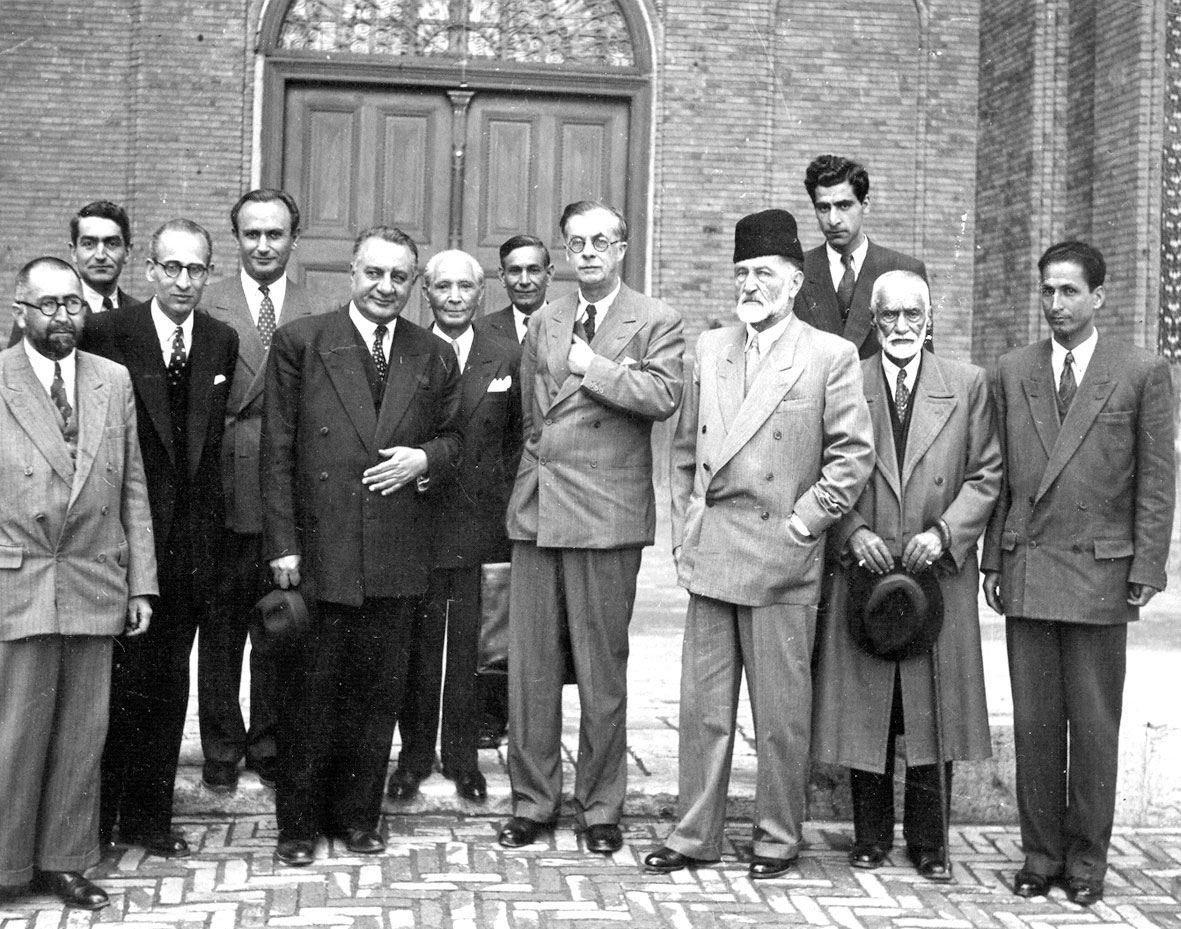 یک قاب سنگین از ادیبان مشهور؛ بدیعالزمان فروزانفر (نفر اول از چپ)، علیاصغر حکمت و سیدجواد ظهیرالاسلام (نایبالتولیه مدرسه سپهسالار).