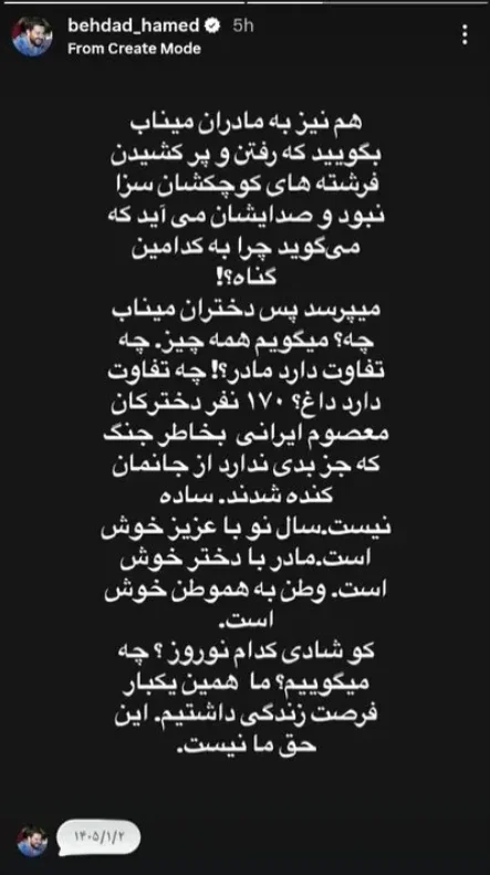 حامد بهداد در یک استوری در فضای مجازی اش به مادران داغدار ناآرامیهای دی ماه اشاره کرد و بعد درباره شهادت دانش آموزان مدرسه میناب در جنگ آمریکا و اسرائیل علیه ایران نوشت:«هم نیز به مادران میناب بگویید که رفتن و پر کشیدن فرشته های کوچکشان سزا نبود و صدایشان می آید که می گوید چرا به کدامین گناه؟!
