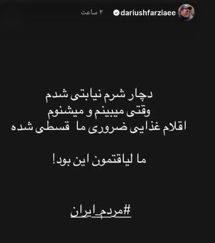 او نوشت که وقتی میبیند ماست، لبنیات و دیگر نیازهای روزمره مردم قسطی شدهاند، دچار شرم نیابتی میشود و این شرایط را ناعادلانه دانست. عمو پورنگ تاکید کرد: ما لیاقتمون این نبود!