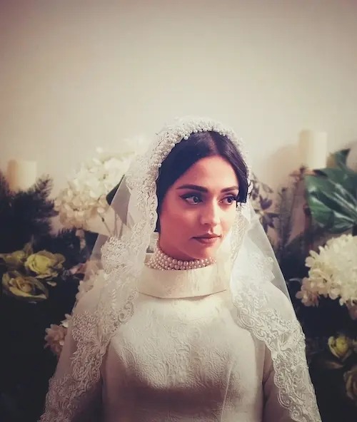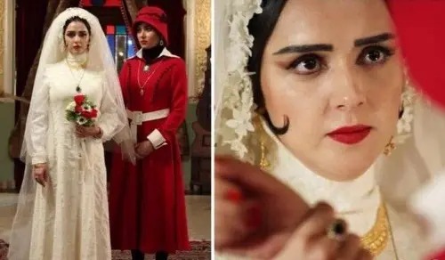 لباس عروس سوگل خلیق در سریال دفتر یادداشت هم با طراحی منحصربهفرد و جزئیات ظریف خود توانست توجه بسیاری را جلب کند. این لباس شامل بالا تنه ساده و یقه ایستادهاش، در کنار گردنبند چندرشتهای مرواریدی و توری بلند، ظریف و گیپوردوزیشده به زیبایی تزئین شده بود. رنگ سفید خالص لباس به همراه یک تور بلند، جلوهای از سادگی و شکوه را به شخصیت او در صحنه عروسی بخشیده بود. انتخاب این لباس بهخوبی با فضای سریال هماهنگی داشت و یکی از ماندگارترین لحظات بصری آن را خلق کرد.