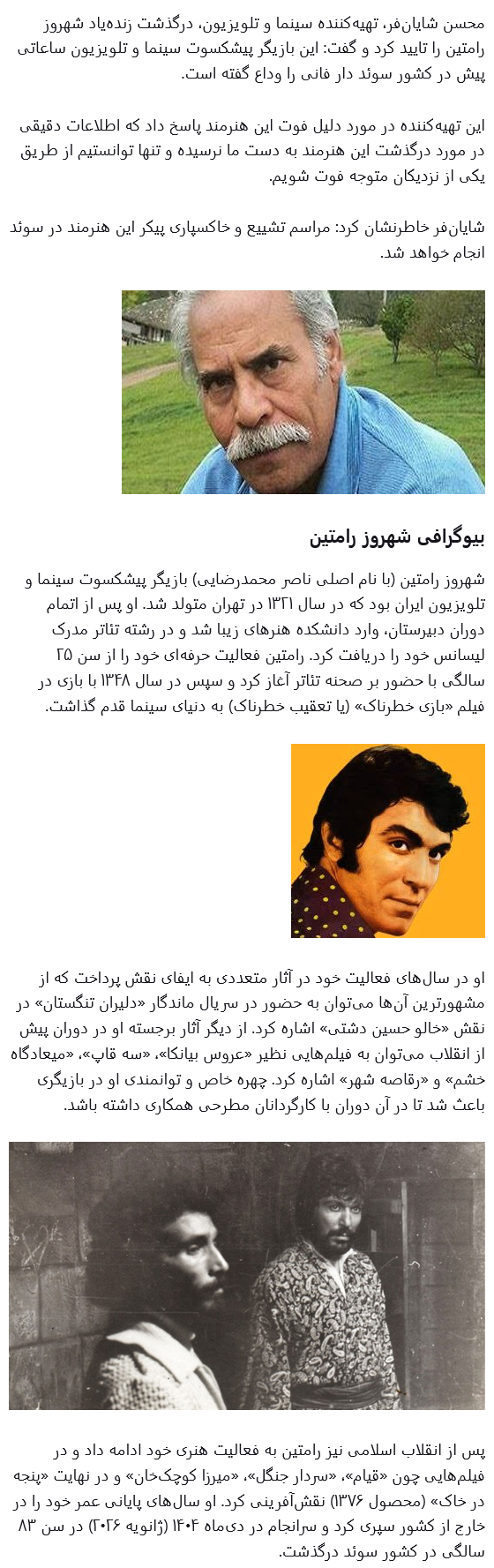 شهروز رامتین از هنرمندان پیشکسوت سینما ساعاتی پیش در سن ۸۳ سالگی در سوئد درگذشت.