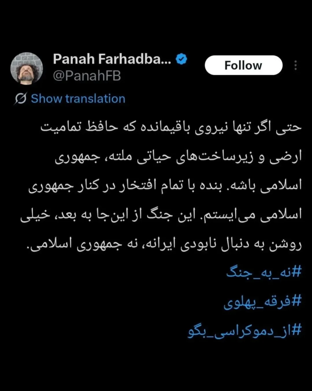 «حتی اگر تنها نیروی باقیمانده که حافظ تمامیت ارضی و زیرساختهای حیاتی ملت، جمهوری اسلامی باشه، بنده با تمام افتخار در کنار جمهوری اسلامی میایستم. این جنگ از اینجا به بعد، خیلی روشن به دنبال نابودی ایرانه، نه جمهوری اسلامی.»