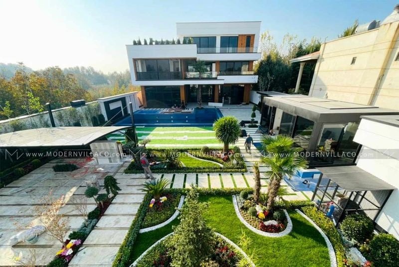 در مورد محوطه ویلا، در لنداسکیپ شاهد پیوستگی میان حجم ویلا و عناصر محوطه به وضوح دیده میشود. ترکیب حجم ویلا و استخر، وجود یک تک درخت در مرکز حجم از جمله شاخصههای بارز در محوطه سازی ویلا است.