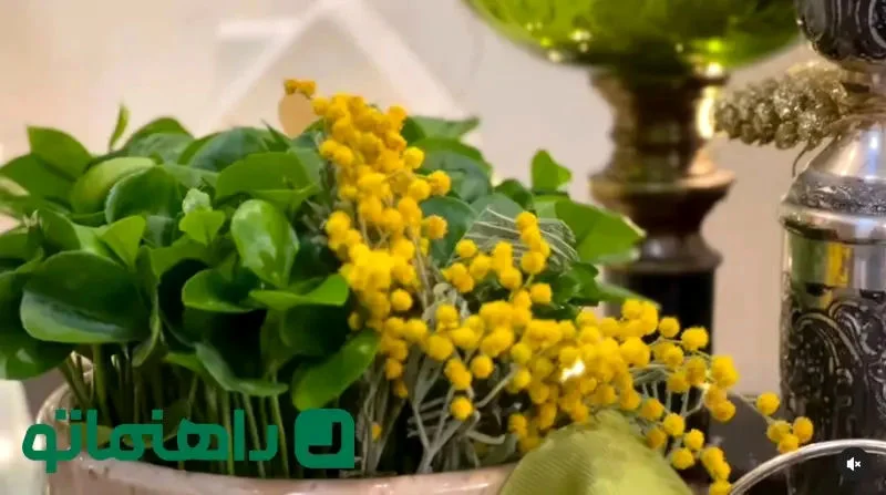 چراغ گردسوز قدیمی که با نور ملایمش گرمای خاصی به فضا بخشیده، شیشه قلیان که بهعنوان گلدان برای گیاهان سبز و گلهای زرد میموزا استفاده شده، و شمعدانهای بلور زرد رنگ که حالا بهعنوان قطعاتی وینتیج شناخته میشوند، همگی یادآور روزگار گذشته هستند.