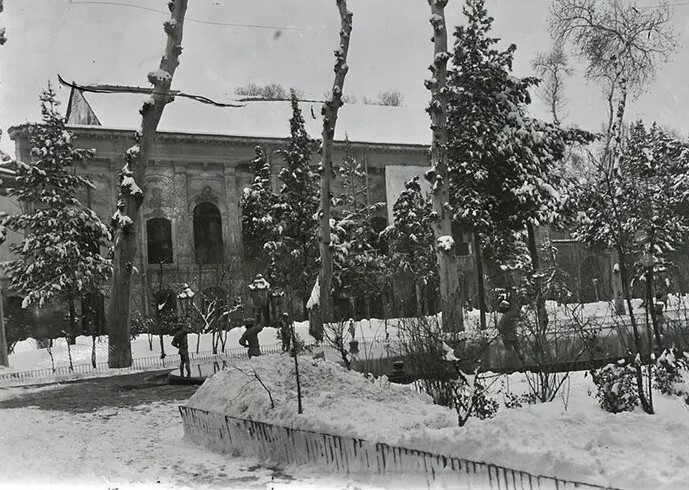 در اینجا تصویری از حیاط و درختان پوشیده از برف کاخ گلستان را در زمان سلطنت مظفرالدینشاه قاجار ملاحظه میکنید.