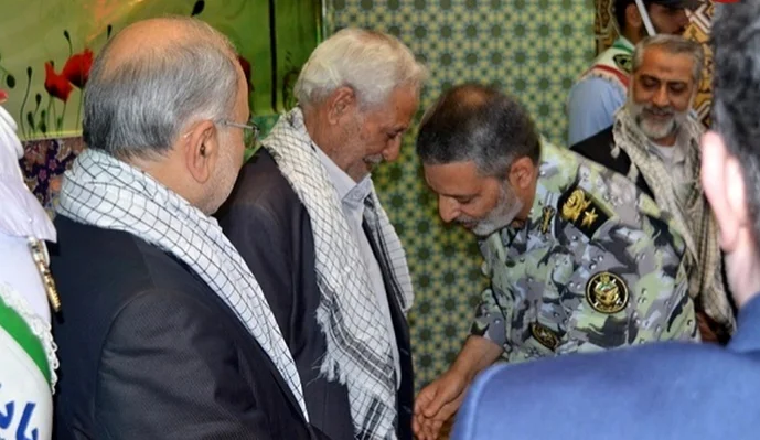 در اینجا تصویری از امیر شهید عبدالرحیم موسوی را در مراسمی در سال 1395 و در حال بوسیدن دست پدرشان ملاحظه میکنید.