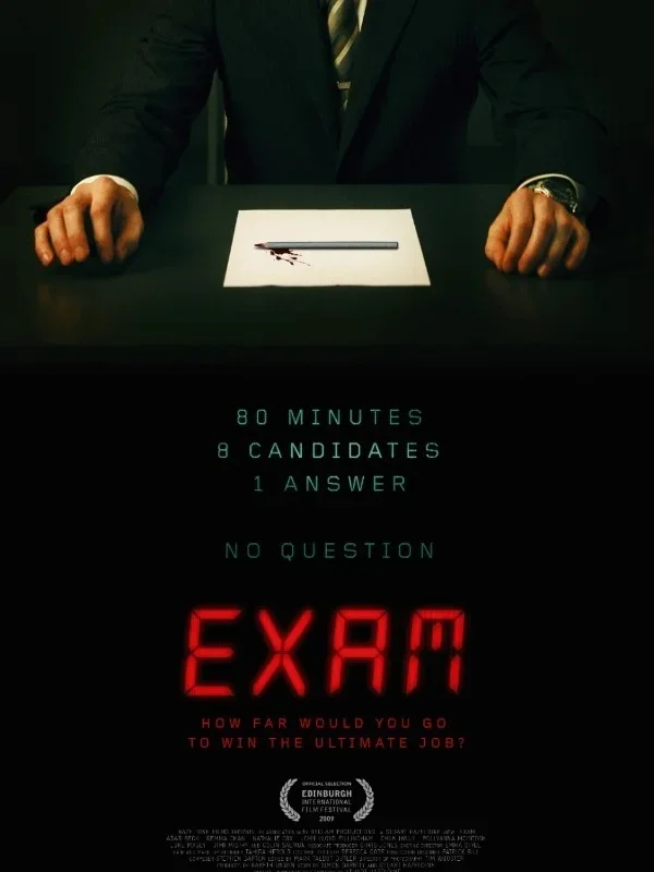 فیلم سینمایی آزمون (Exam) یک تریلر روانشناختی، معمایی به نویسندگی و کارگردانی استوارت هازلدین در سال ۲۰۰۹ سینمای بریتانیا است. این فیلم دربارهی هشت کاندید برگزیده است که به آخرین مرحله از مصاحبهی شغلی برای استخدام در یک شرکت قدرتمند و مرموز، راه پیدا کردهاند. این افراد پس از ورود به یک اتاق بدون پنجره، هشتاد دقیقه فرصت دارند تا به یک سوال ساده پاسخ دهند. فیلم آزمون در ایجاد تدریجی حس تنش و ناامیدی و نشان دادن رفتارهای عجیب انسانها برای رسیدن به شغل مدنظرشان، بسیار دقیق عمل میکند. در این فیلم دو ساعته، بازیگرانی نظیر آدار بک، جما چان، ناتالی کاکس، لوک مابلی و … ایفای نقش کردهاند.