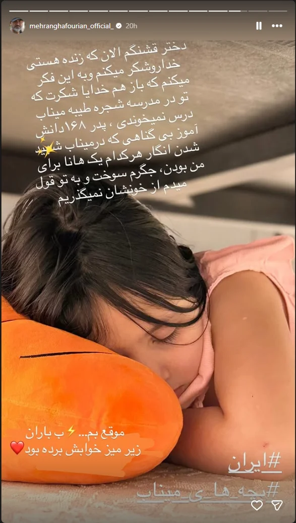غفوریان که این روزها با انتشار پیامهای متعدد، همدردی و حمایت خود را از مردم ایران و مدافعان وطن ابراز کرده است، با اشاره به دخترش و شباهتش به دانشآموزان شهید میناب، از عمق اندوه خود برای این کودکان بیگناه گفته است.