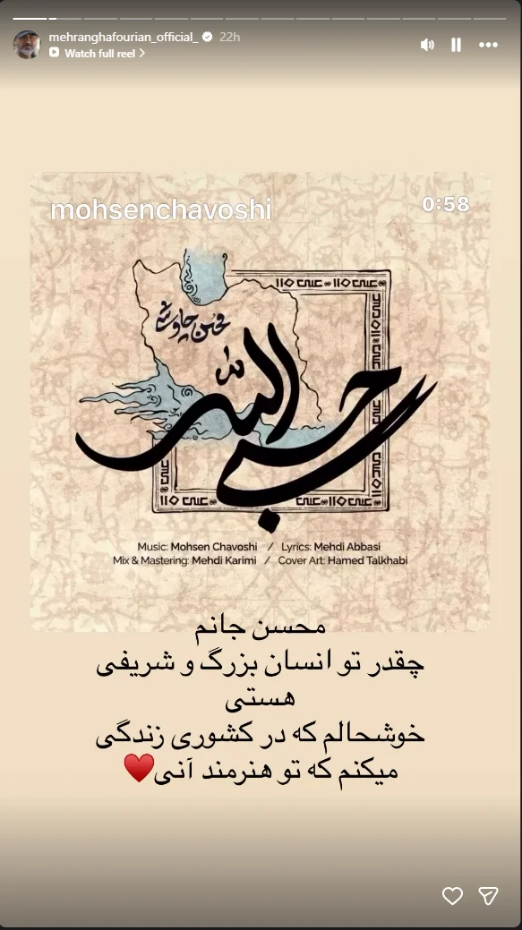 او همچنین با بازنشر آهنگ «حسبی الله» محسن چاوشی در اینستاگرام خود، از این هنرمند حمایت کرد و نوشت: