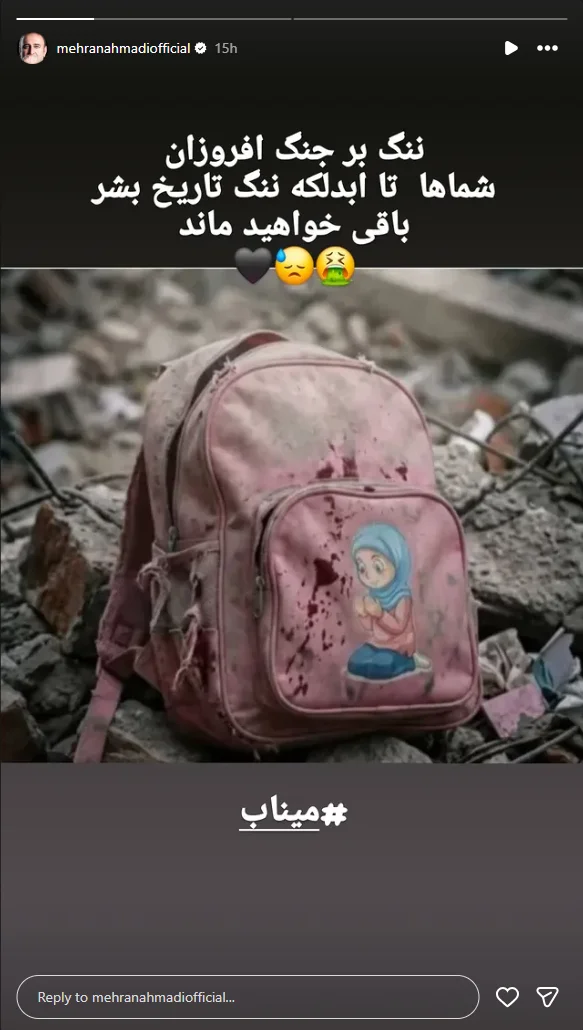 به گزارش هفت صبح، مهران احمدی، بازیگر و کارگردان شناختهشده سینما، تلویزیون و تئاتر ایران، با انتشار استوری در صفحه اینستاگرام خود، تصویری از کیف خونین یک دانشآموز دبستانی متعلق به میناب را منتشر کرد و جنایات آمریکا و رژیم صهیونیستی را به شدت محکوم کرد.