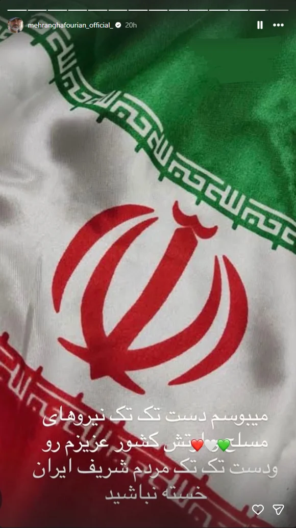 مهران غفوریان، بازیگر و کمدین محبوب سینما و تلویزیون، با انتشار متنی در اینستاگرام، از نیروهای مسلح و ارتش ایران تقدیر کرد و به مردم ایران خسته نباشید گفت.