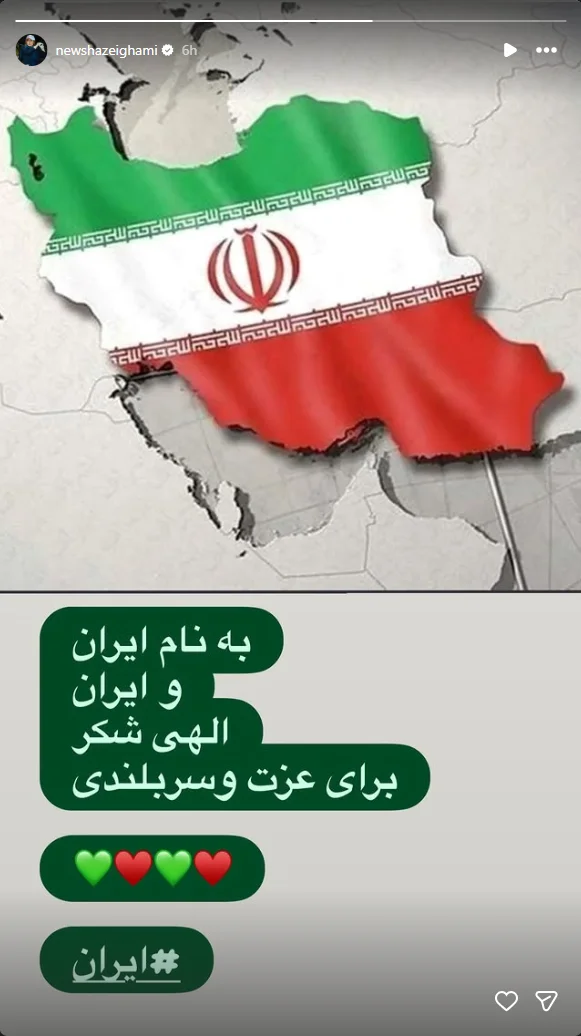 به گزارش هفت صبح، نیوشا ضیغمی، بازیگر شناختهشده سینما و تلویزیون ایران، با انتشار استوری در صفحه اینستاگرام خود، عشق و ارادت خود را به ایران به نمایش گذاشت. او با انتشار تصویری از نقشه کشور، متنی کوتاه اما پرمعنا نوشت: