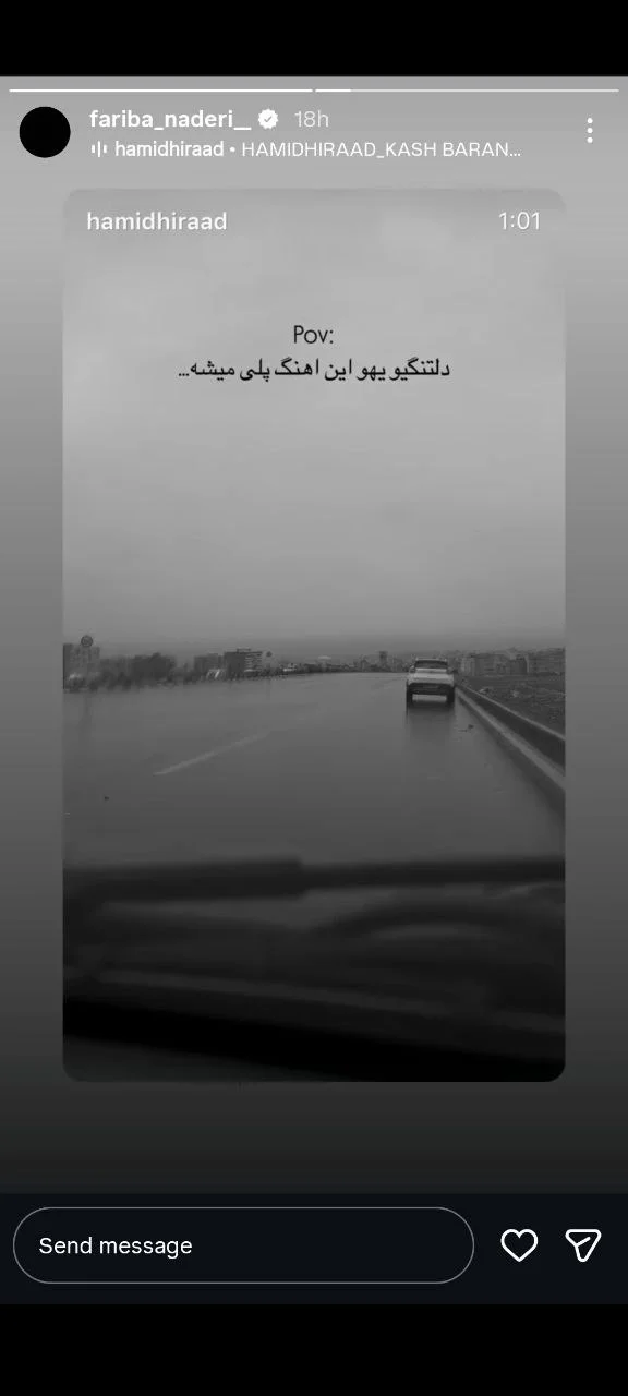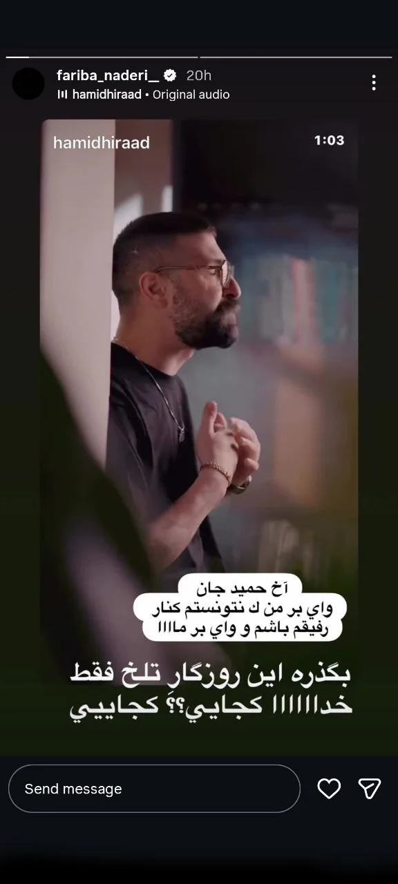 فریبا نادری، بازیگر نامآشنای سینما و تلویزیون که این روزها در غم از دست دادن حمید هیراد، خواننده محبوب موسیقی پاپ به سوگ نشسته، با انتشار استوری در صفحه اینستاگرام خود، اندوه عمیقش را اینگونه به اشتراک گذاشت.