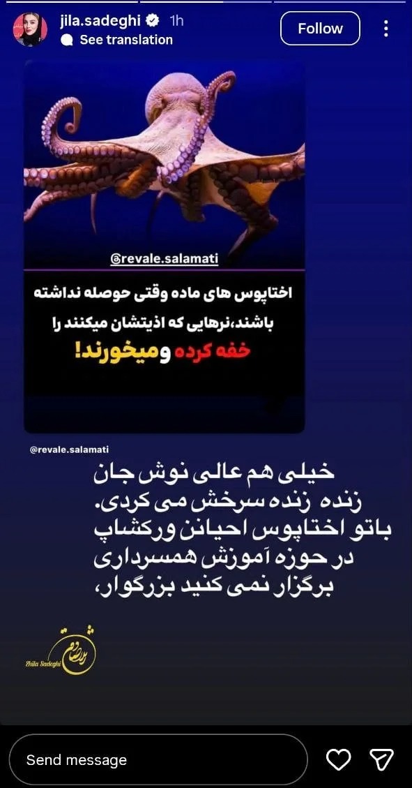 به گزارش هفت صبح ژیلا صادقی، مجری پرحاشیه صداوسیما، با بازنشر یک مطلب علمی در صفحه اینستاگرامش بار دیگر خبرساز شد. این مطلب درباره رفتار اختاپوسهای ماده بود که طبق آن، در شرایطی خاص و زمانی که حوصله ندارند، نرهایی را که آنها را آزار میدهند خفه کرده و میخورند.