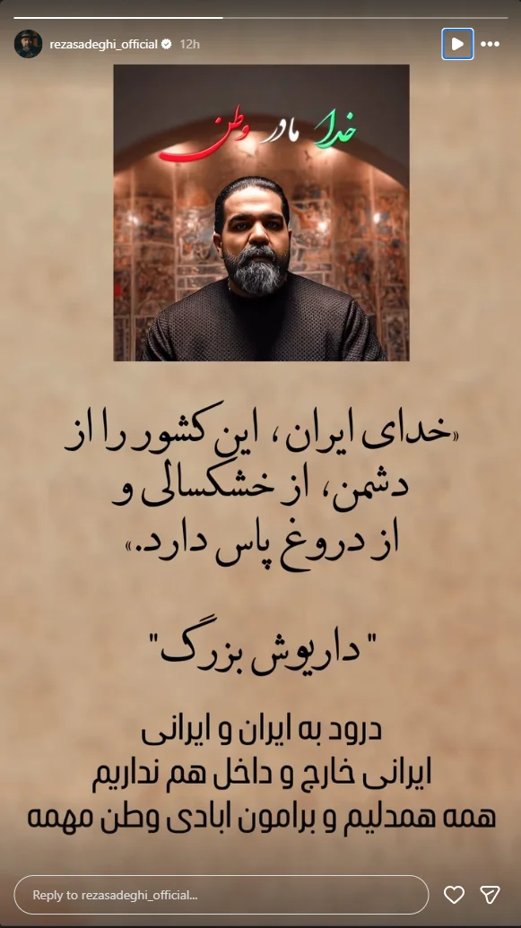 به گزارش هفت صبح، رضا صادقی، خواننده نامآشنای موسیقی پاپ ایران که با آهنگ ماندگار «خدا، مادر، وطن» در دل میلیونها ایرانی جای دارد، با انتشار عکسی در صفحه اینستاگرام خود، متنی میهنی و دعایی منتشر کرد.