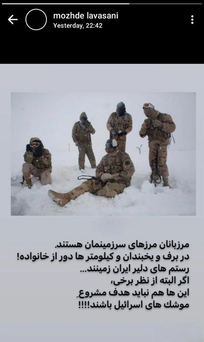 «مرزبانان، نگهبانان خستگیناپذیر این خاکاند؛ در دل یخبندان، دور از خانواده و در اوج ازخودگذشتگی. رستمهای زمانه ما هستند؛ هرچند بهنظر میرسد از نگاه برخی، حتی آنان هم هدفی مشروع برای موشکهای اسرائیل نیستند.»