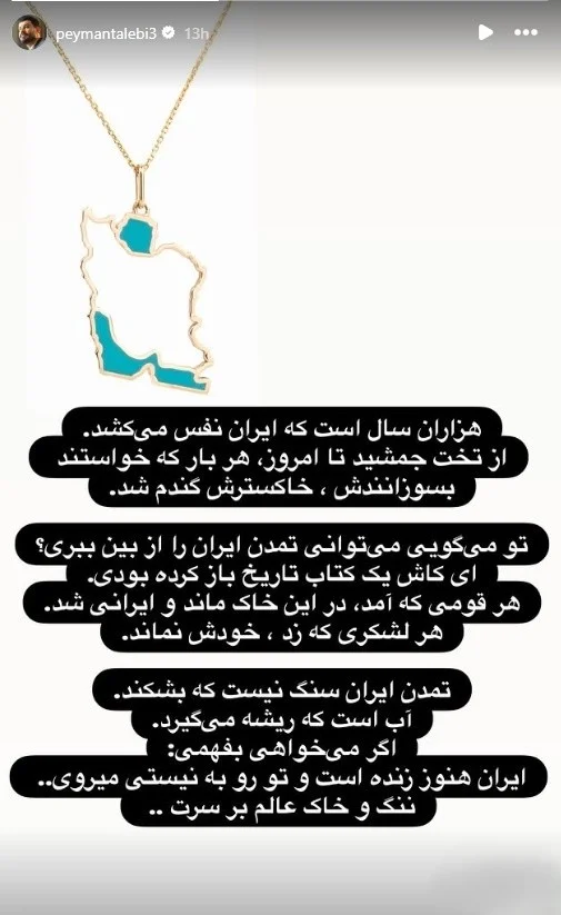 پیمان طالبی پستی در اینستاگرام در واکنش به حملات آمریکا و اسرائیل منتشر کرد.