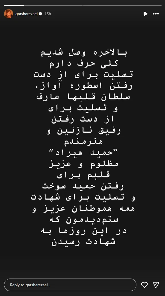 «بالاخره وصل شدیم. کلی حرف دارم. تسلیت برای از دست رفتن اسطوره آواز، سلطان قلبها عارف و تسلیت برای از دست رفتن رفیق نازنین و هنرمندم حمید هیراد" مظلوم و عزیز قلبم برای رفتن حمید سوخت و تسلیت برای شهادت همه هموطنان عزیز و ستمدیدمون که در این روزها به شهادت رسیدن.»