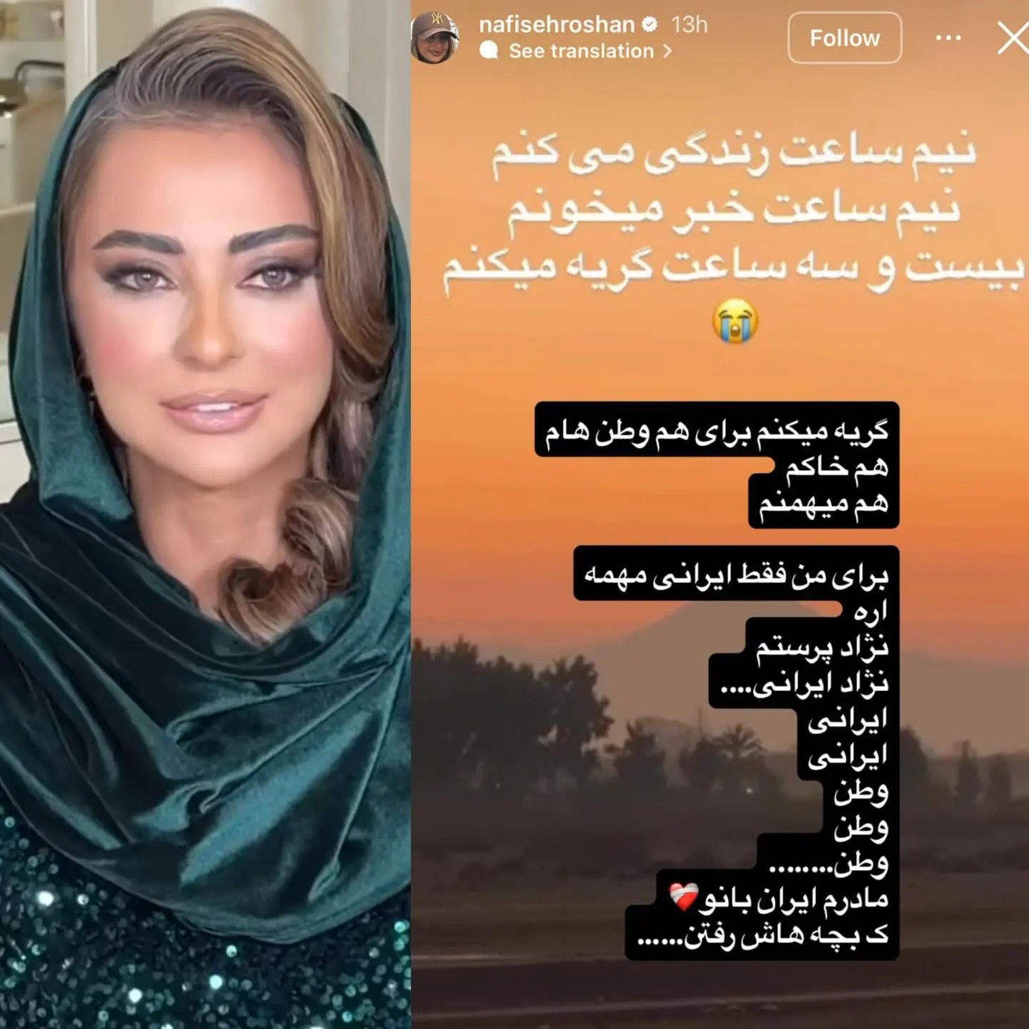 به گزارش هفت صبح، نفیسه روشن، بازیگر شناختهشده تلویزیون، با انتشار یک استوری اینستاگرامی به حوادث تلخ دیماه ۱۴۰۴ واکنش نشان داد و احساساتش را با مخاطبان در میان گذاشت. او در این استوری نوشت که تنها روزی نیم ساعت زندگی میکند، نیم ساعت به خواندن خبرها میگذرد و باقی ساعاتش صرف گریه برای خاک و میهن میشود. این واکنش احساسی خیلی زود در فضای مجازی بازتاب پیدا کرد و توجه گسترده کاربران را به خود جلب کرد.