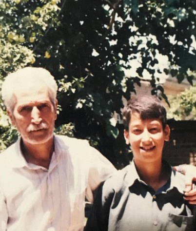 در یکی از عکسهای قدیمیتر که فضای نوستالژیک دارد، بهرام افشاری در کنار پدرش دیده میشود. پسزمینهی تصویر، حیاطی سرسبز است؛ با درختان بلند و باغچهای پر از گل. نردههای سادهی فلزی و دیوارهای آجری نشان از یک خانهی قدیمی و صمیمی دارند، جایی که ریشههای او در آن شکل گرفتهاند. این تصویر، به نوعی پلیست میان گذشته و حال؛ میان خانهای با حالوهوای سنتی و خانهی امروزی با سلیقهای هنری و مدرن.