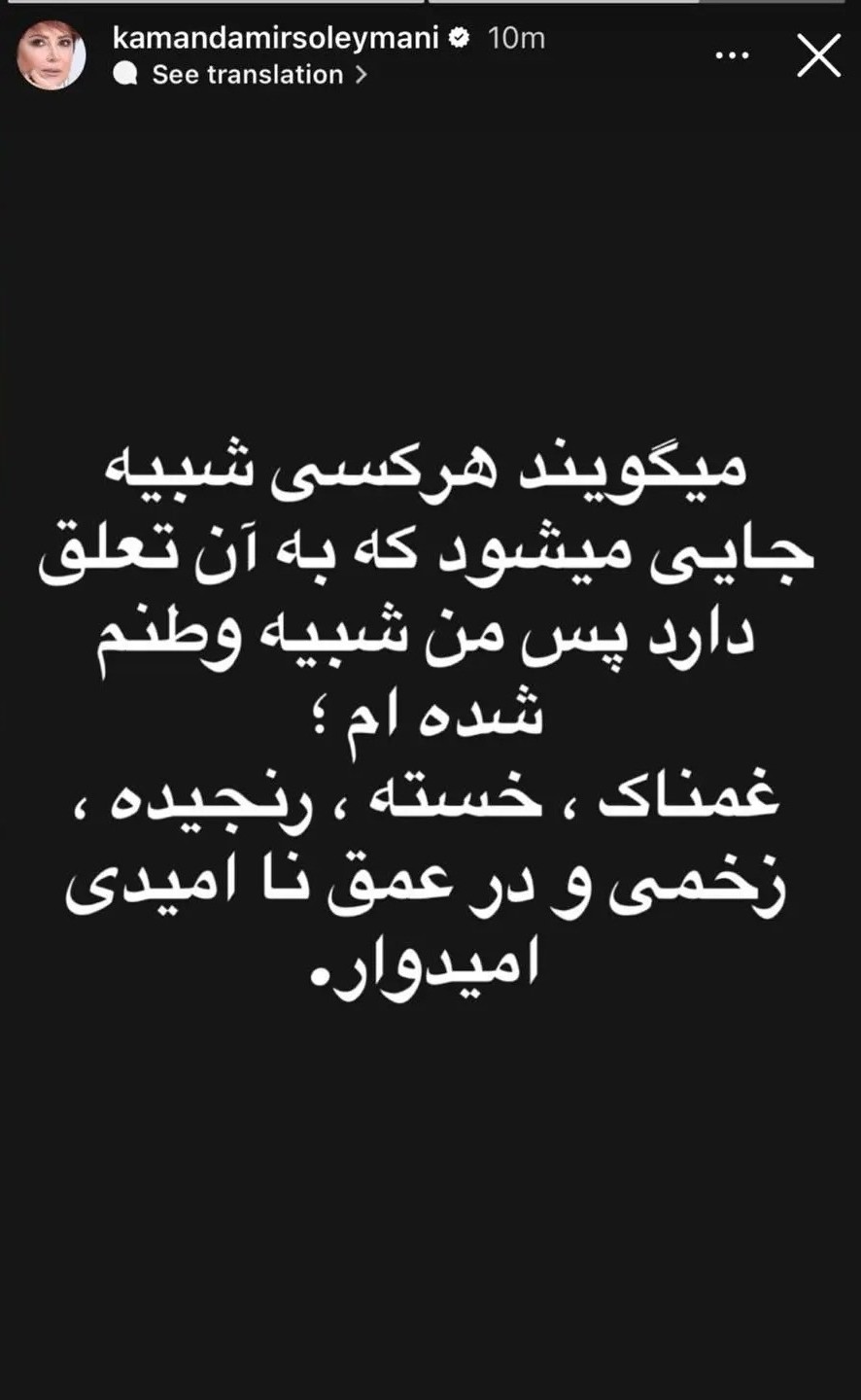 به گزارش هفت صبح، کمند امیرسلیمانی، بازیگر سینما و تلویزیون که بسیاری او را با نقشآفرینی در مجموعه خاطرهانگیز پدرسالار به یاد میآورند، با انتشار استوریای غمانگیز در صفحه شخصیاش توجه مخاطبان را جلب کرد. این بازیگر که از کودکی وارد عرصه هنر شده و سالها در تئاتر، تلویزیون و سینما فعالیت داشته، در تازهترین واکنش خود حال و هوای متفاوت و اندوهگین این روزهایش را با مخاطبانش به اشتراک گذاشت.