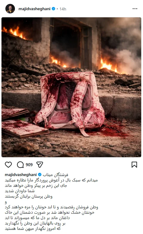 به گزارش هفت صبح، مجید واشقانی، بازیگر شناختهشده سینما و تلویزیون ایران که با نقشآفرینی در آثاری همچون «پایتخت»، «میکائیل» و «آنام» در دل مخاطبان جای دارد، در روزهای آغازین سال ۱۴۰۵ با انتشار تصویری تأثرانگیز در صفحه اینستاگرام خود، یاد دانشآموزان شهید میناب را گرامی داشت.