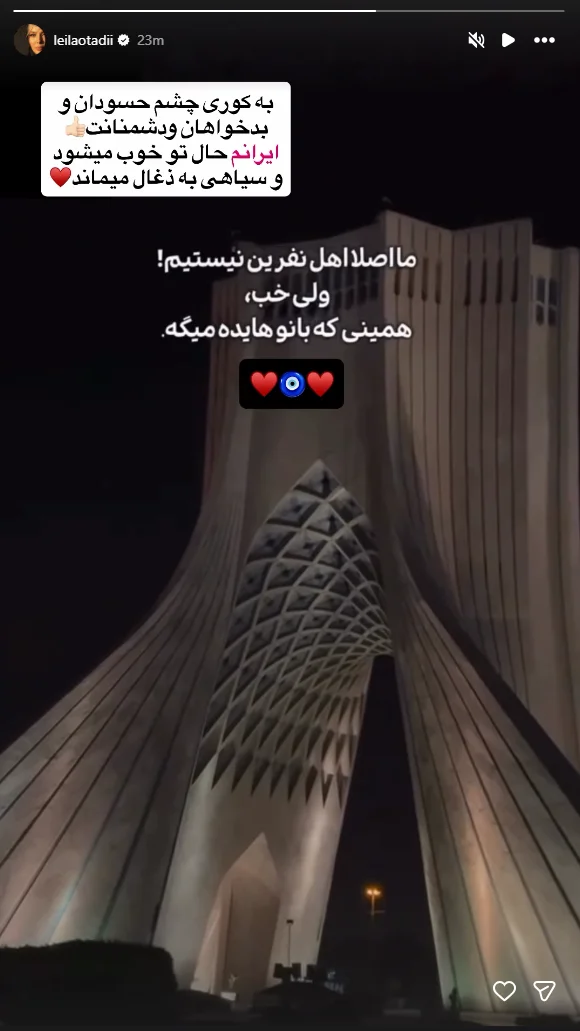 لیلا اوتادی، بازیگر سینما و تلویزیون، با انتشار عکسی از برج آزادی در اینستاگرام نوشت: به کوری چشم حسودان و بدخواهان و دشمنانت ایرانم، حال تو خوب میشود و سیاهی به ذغال میماند.