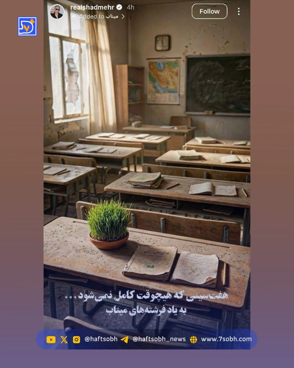 به گزارش هفت صبح، شادمهر عقیلی، خواننده و آهنگساز شناختهشده موسیقی ایران، در روزهای آغازین سال ۱۴۰۵ با انتشار تصویری از یک مدرسه در صفحه شخصی اینستاگرام خود، یاد دانشآموزان بیگناه میناب را گرامی داشت.