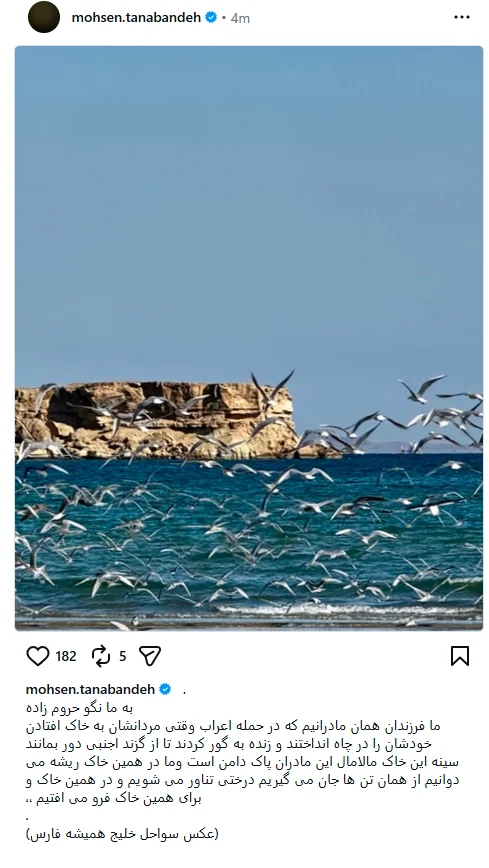 به گزارش هفت صبح، محسن تنابنده، بازیگر محبوب و مردمی سینما و تلویزیون ایران که با نقشآفرینی در آثاری همچون «پایتخت»، «زودپز» و «رهایم کن» در دل میلیونها مخاطب جای دارد، با انتشار تصویری از خلیج همیشه فارس در صفحه اینستاگرام خود، متنی حماسی و غیرتمندانه در دفاع از هویت ایرانی نوشت.