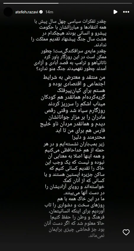 به گزارش هفت صبح، عاطفه رضوی، بازیگر شناختهشده سینما و تئاتر ایران، با انتشار متنی تأملبرانگیز و تند در صفحه شخصی اینستاگرام خود، به مسائل مرتبط با جنگ، شرایط اجتماعی و برخی مواضع سیاسی واکنش نشان داد.