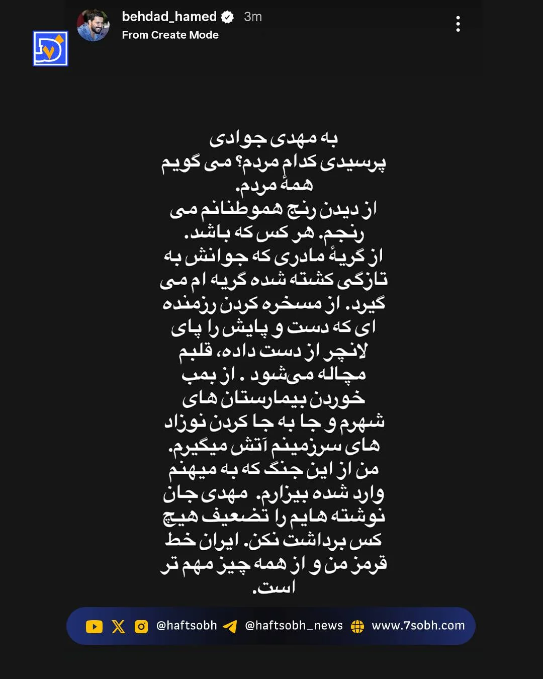 حامد بهداد: ایران خط قرمز من و از همه چیز مهمتر است.