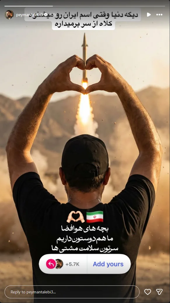 پیمان طالبی، مجری معروف صدا و سیما و رادیو، با انتشار استوری در اینستاگرام از تلاشهای شبانهروزی نیروهای هوا فضای کشور در جنگ رمضان قدردانی کرد و نوشت: دیگه دنیا اسم ایران را میشنود، کلاه از سر برمیدارد.