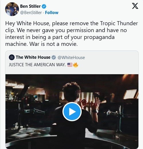بن استیلر در واکنش به این اقدام در شبکه اجتماعی ایکس نوشت: «سلام کاخ سفید، لطفاً کلیپ مربوط به فیلم “تندر استوایی” را حذف کنید. ما هرگز به شما اجازه استفاده از آن را ندادیم و هیچ علاقهای نداریم که بخشی از ماشین تبلیغاتی شما باشیم. جنگ فیلم نیست.»